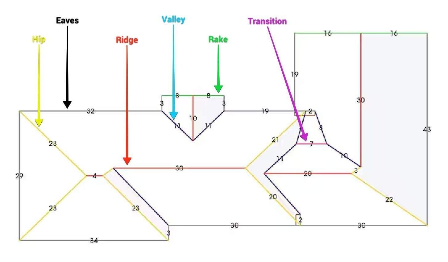 Transition: The area where two different roof sections or materials meet, such as where a steep slope connects to a flat surface or a new addition joins the existing roof.